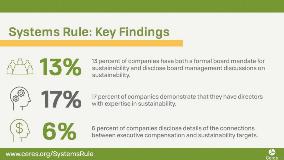 - Many large companies state that their boards oversee sustainability; however their systems are largely rudimentary or piecemeal. Just 13 percent have both a formal board mandate for sustainability and disclose board-management discussions on sustainability; 17 percent have directors with expertise in sustainability, and 6 percent disclose connections between executive compensation and sustainability targets.