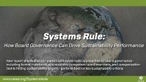 Yet while businesses recognize the advantages of integrating sustainability into board governance, it’s not always easy to do. In our Conservation and Financial Markets Initiative, we support work to help companies eliminate the risks that environmental degradation poses, and seize opportunities associated with improved sustainability. With related support, Ceres has released a new report, Systems Rule: How board governance can drive sustainability performance. Researchers analyzed the board governance systems and sustainability performance of 475 of the world’s largest publicly held companies listed on the Forbes Global 2000.